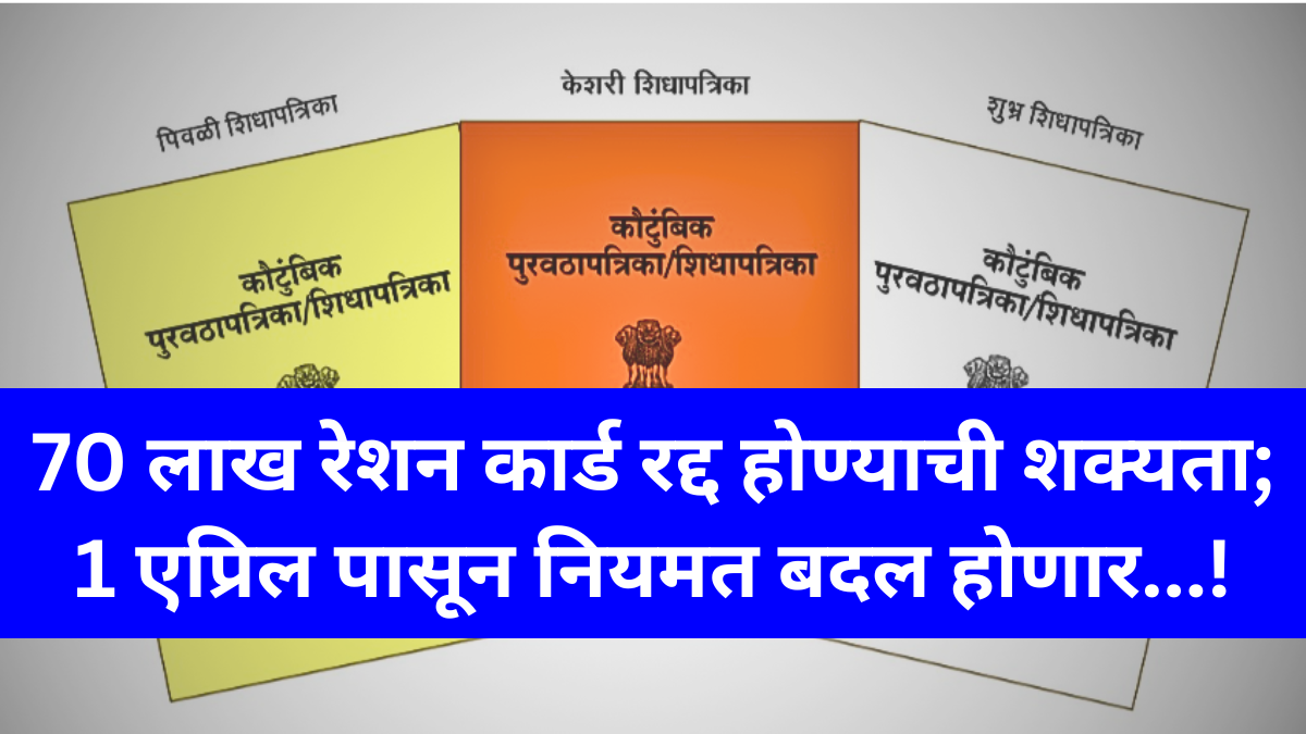 तसेच रेशन कार्ड च्या नियमात एक एप्रिल पासून नवीन नियम लागू होणार आहेत 70 लाख रेशन कार्ड रद्द होण्याची शक्यता वर्तवण्यात येत असून यामध्ये लाखो रेशन कार्ड धारकांचे रेशन कार्ड रद्द होण्याची शक्यता वर्तवली जात आहे तसेच अनेक लाभार्थ्यांचे नाव देखील काढून टाकले जाणार आहे.