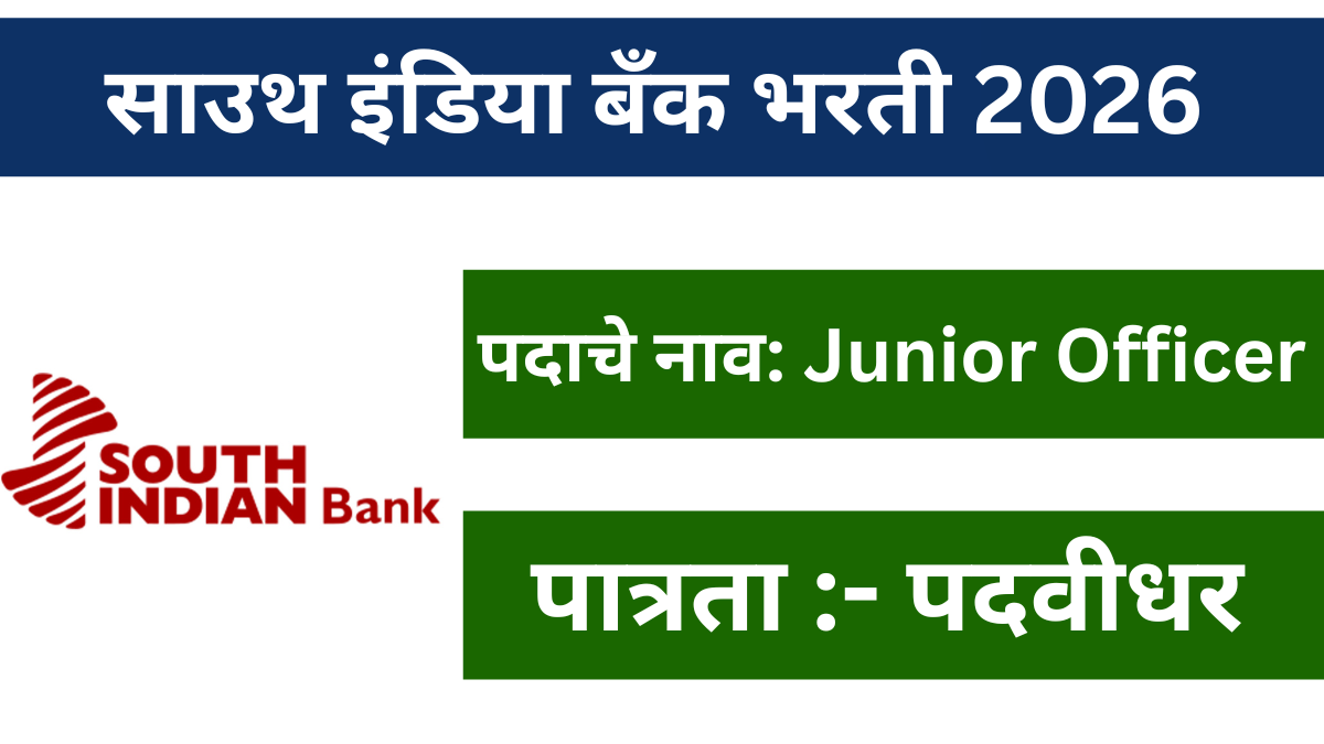 South Indian Bank Bharti 2026 भारतातील आघाडीच्या खासगी बँकांपैकी एक असलेल्या South Indian Bank ने 2026 साठी Junior Officer (Business Promotion Officer) पदांसाठी भरती जाहीर केली आहे. बँकिंग क्षेत्रात करिअर करू इच्छिणाऱ्या तरुणांसाठी ही एक उत्कृष्ट संधी आहे. आकर्षक वेतन, स्थिर नोकरी, करिअर ग्रोथ आणि प्रतिष्ठित संस्थेत काम करण्याची संधी या भरतीमुळे उपलब्ध होत आहे.